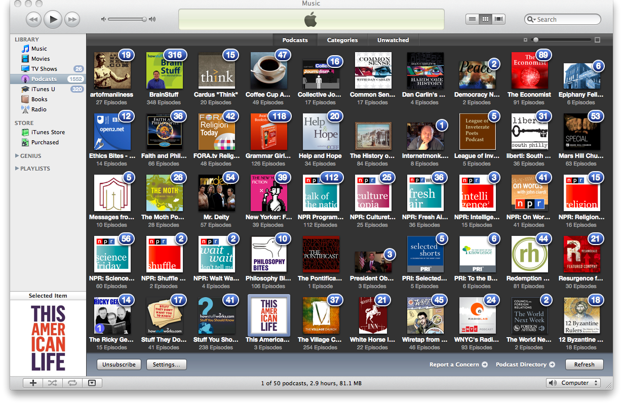 Look at that picture above. Click on it to make it bigger. That’s my iTunes. As you can see, I listen to a LOT of podcasts. And no, this isn’t just a narcissistic moment to seem smart. You see all those blue numbers above each podcast? Well, those are just the episodes I haven’t listened to. Also notice the 320 iTunesU lectures that have also been neglected.