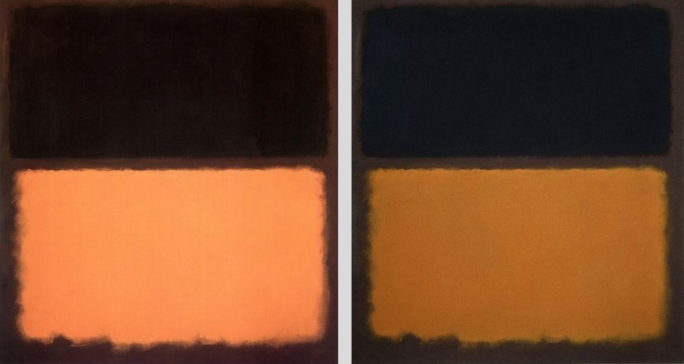 Still don’t get it? Here’s a quick exercise. Look at the two pieces below. The one on the right is the genuine Rothko. The one on the left is one of those reproductions where someone paints it inch for inch as close to the original as possible.