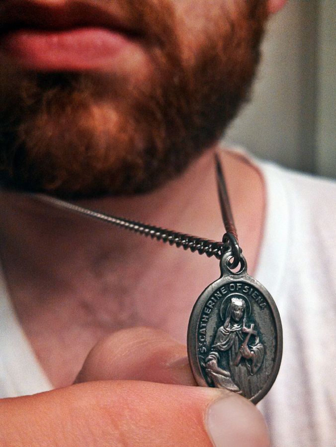 I went to the only Catholic gift shop I knew of in Philly and found the necklace you can see below. As you can see, I messed up. I grabbed this out of the “Catherine” bin, not thinking there was more than one Saint Catherine—but there is. Later, I realized I had picked up the wrong saint but figired this was Providence at work. So I decided to stick with this saint and only then did I start googling to find out who my new patron saint was.