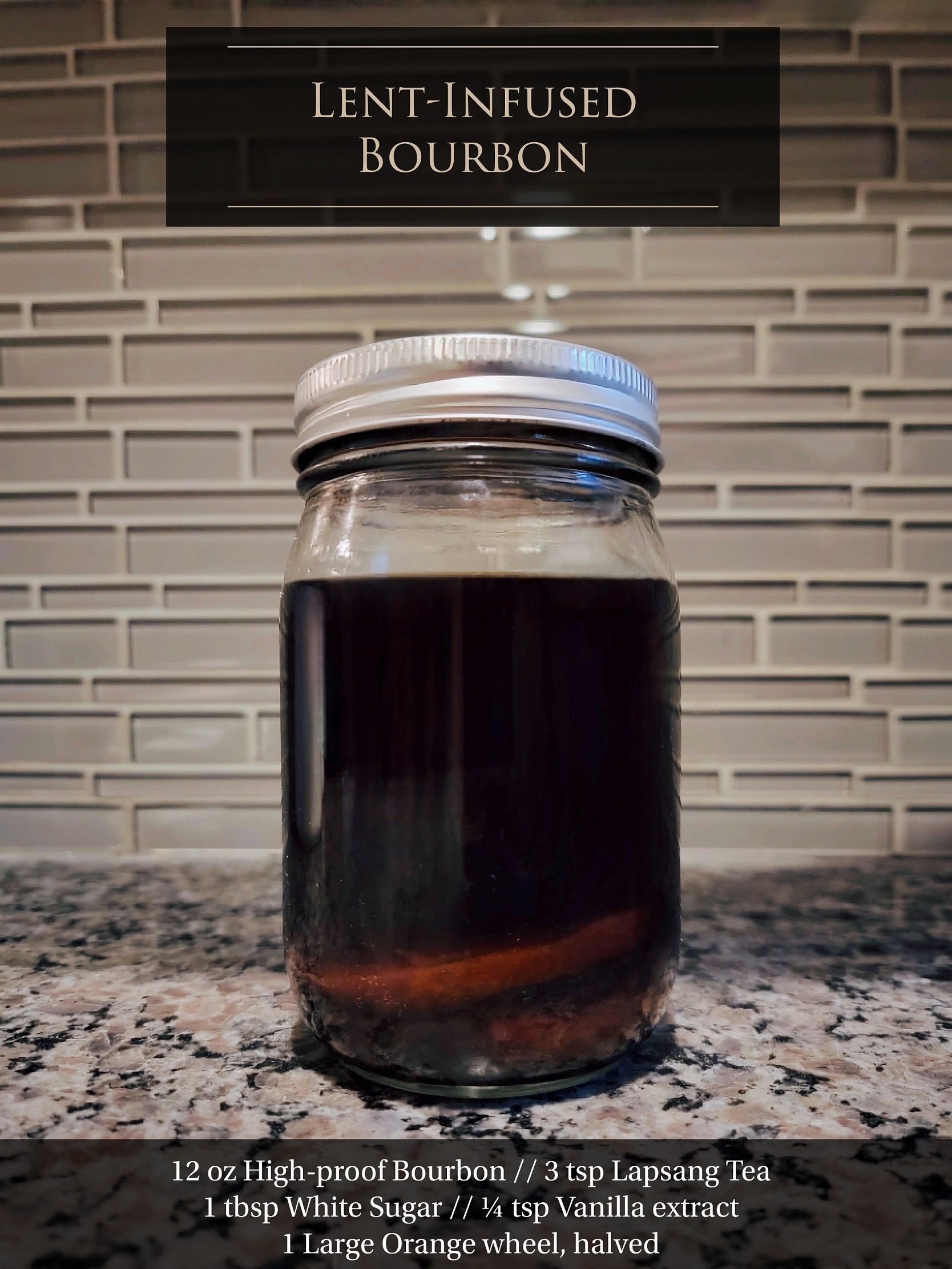 This recipe makes a high proof bourbon that is very smoky, with a touch of citrus and sweetness that really gives a lot of complexity, perfect for Lenten reflection whether you drink it straight or in a cocktail (it makes an amazing Old Fashioned).