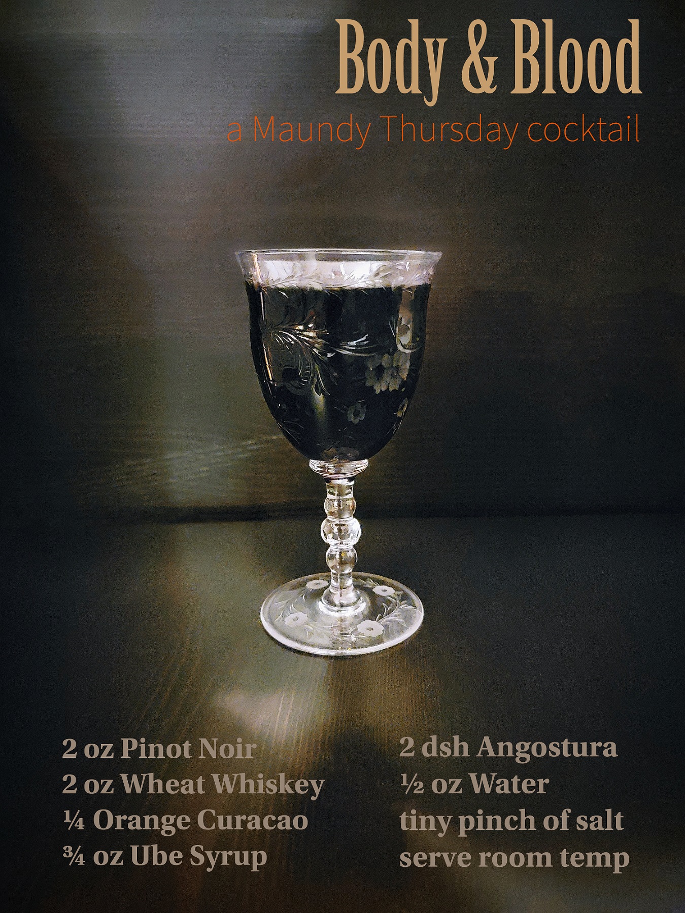 There’s a lot of symbolism in this drink. The most obvious is wine and wheat, for the bread and drink of the last supper. It is served at room temperature like the wine of the meal.