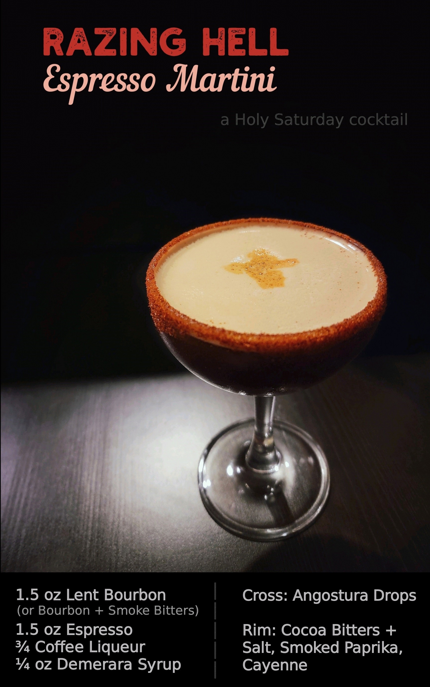 Today’s cocktail honors this act. It uses Holy Tuesday’s Lent-Infused Bourbon to make a smoky, sweet espresso martini that represents death. The Angostura drops in the shape of a cross represent Jesus himself in the midst of death. This part of the drink is really smooth and great on its own.