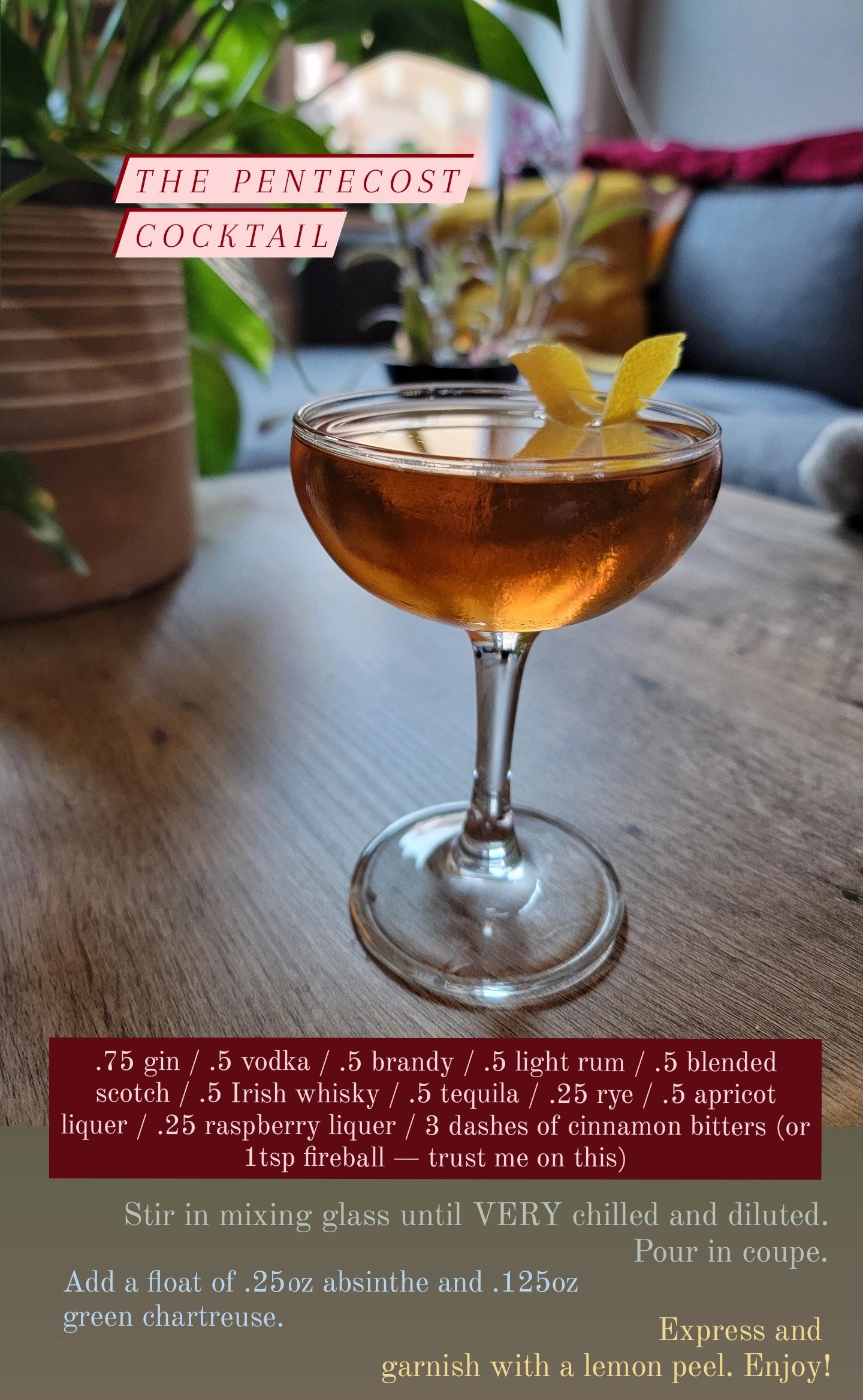 Today is Pentecost, which is all about the Holy Spirit descending and indwelling Christians, creating unity out of a multi-ethnic, multi-lingual group of people. So, I wanted to create a cocktail that had as many “spirits” from as many regions as possible (get it?).
