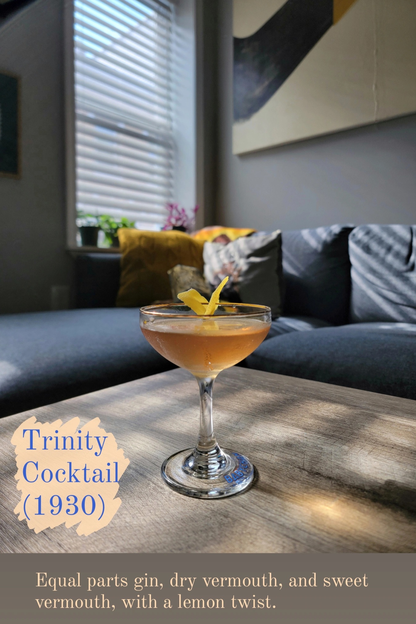 The 1930 Trinity Cocktail is from Harry Braddock’s classic Savoy Cocktail Book. It tastes like a martini, but sweeter. Simple, classic, and great.