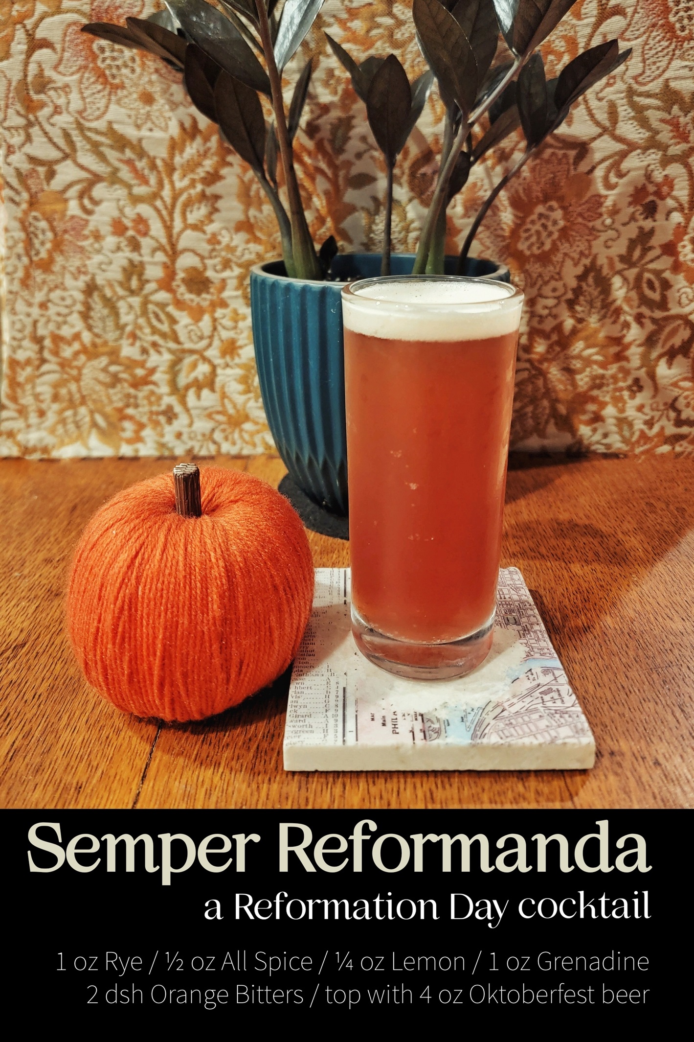 This is my first beer cocktail, and it is really good. It’s a tweaked version of the “Lumberjack in Love” by the always-fantastic Anders Erikson. Like the Reformation itself, this drink is bitter and sweet. Rye embodies Luther’s own spice and bite. The All Spice captures the Reformation truth that all of God’s people are priests and saints in his kingdom. And lastly, of course, we top it all off with that most German of autumnal beers: the Oktoberfest. Prost!