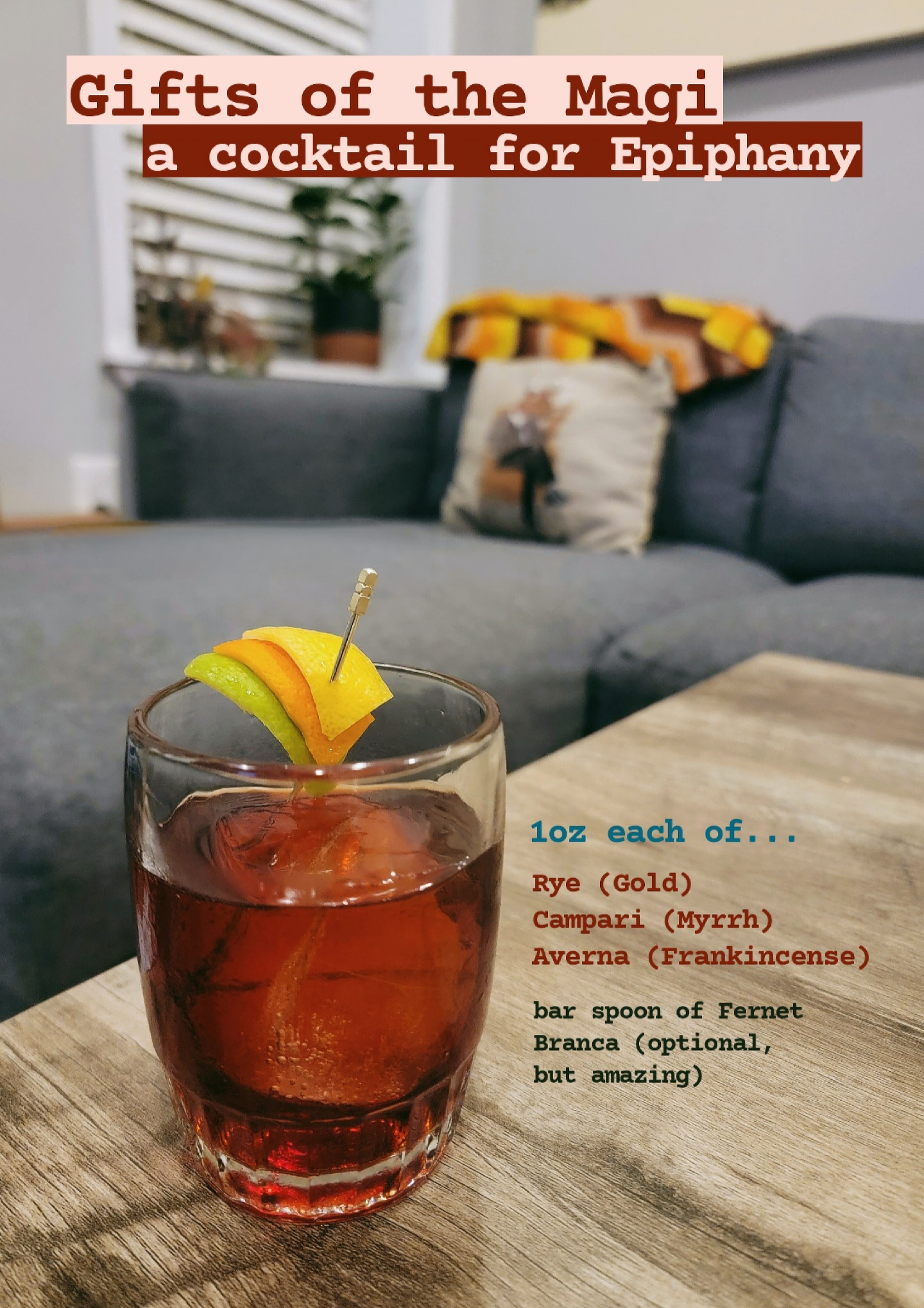 The drink itself leans earthy and complex. The rye brings structure, the tequila adds depth, and the Suze’s golden gentian bitterness contributes an interesting mid-note to the flavors. The Carpano Antica and the Ruby Port round it out with deep, red sweetness, like the shared wine of communion: one cup, many vineyards. Lastly, the Islay Scotch float and the flamed orange peel garnish image the tongues of fire hovering over those first Christians.